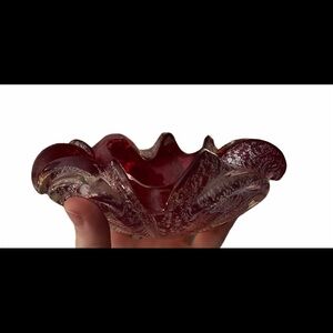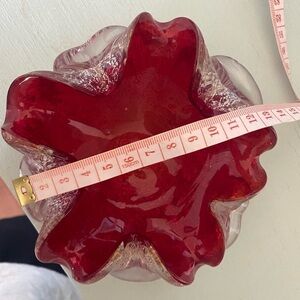 Euc one small chip noted to the very base. Does not affect look or function of the item. Very beautiful red/clear hand blown glass with silver flecs detailing throughout.