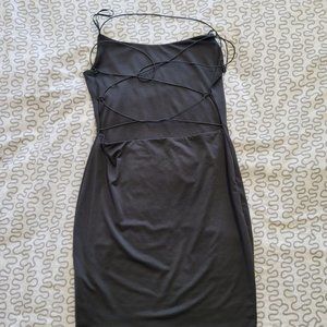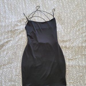 A true closet staple for us Girls. A little black dress with back-out straps perfect for a night out with the gals. 95% Rayon, 5% Spandex which leaves the dress feeling sleek/silky. Have only been worn once to a birthday party. Worth noting that underwear does not print at the back.