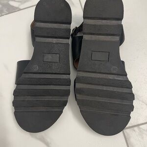 Bueno's black platform leather sandals. Featuring a minimalist design with two wide straps and an adjustable ankle strap, these sandals are ideal for everyday summer wear. The flat sole and cushioned footbed ensure all-day comfort. Heel is 2.5 inches high.