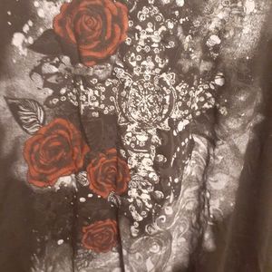 Black t-shirt with a pretty white rhinestone cross and red roses graphic. Rarely worn and in good condition. No missing rhinestones.