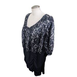 MXM Womens Plus Size 4X Blouse Black White Lace Print Puff Sleeve Ruched Front
