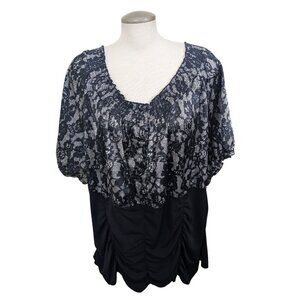 MXM Womens Plus Size 4X Blouse Black White Lace Print Puff Sleeve Ruched Front