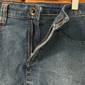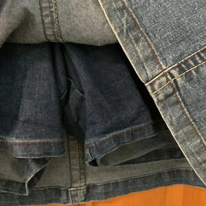 Medium dark wash denim skirt with zipper and back pockets. Note one back pocket missing the brass ring circle however the underside is there - may be replaced. Has stretch! Size 14. See photos for measurements.