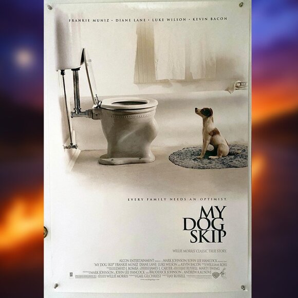 This original double sided theatrical one-sheet for My Dog Skip (2000) features a clean, minimalist design with a sweet, comedic touch: a small dog sits patiently on a bathmat, staring up at an oversized toilet in a bright, white bathroom—perfectly capturing the film’s gentle humor and heart. The poster highlights the cast Frankie Muniz, Diane Lane, Luke Wilson, and Kevin Bacon, and includes the tagline “Every family needs an optimist.” A charming, feel-good collectible for dog lovers and fans of nostalgic, family-friendly cinema.