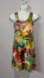 The dress is adorned with a variety of hues including bright oranges, reds, and greens, creating a playful and artistic look.