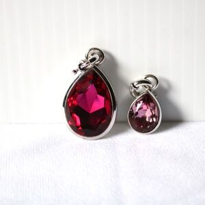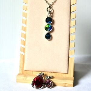 Stunning set of three (3) Myka detachable pendants with Myka silver-tone chain (bright rhodium finish). Made with Swarovski Crystals these pendants sparkle and allow you to mix and match depending on your outfits! One pendant features three crystals in blues and greens, one has a large hot pink tear shaped crystal, and one small light pick tear shape pendant. Attach and remove with the sturdy lobster claw closure. Designed and manufactured in CANADA! Pre-owned but lightly used and in excellent condition. Smoke-free, pet friendly home!
