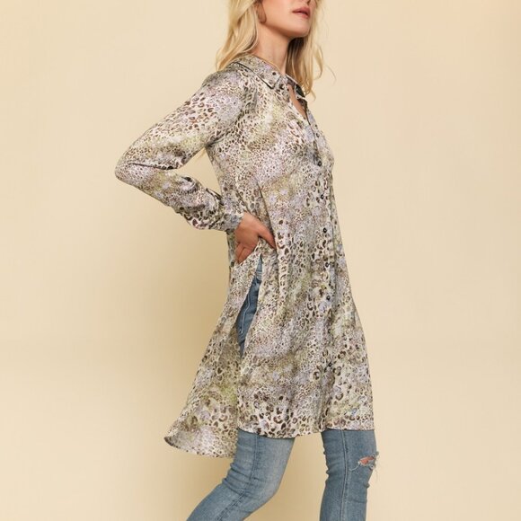 Animal Print Longline Button Down Tunic, Collared High-Low Shirt Dress Top with Pockets