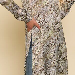 animal print blouse, tunic top, duster cardigan, high-low shirt, leopard print shirt dress, longline blouse, resort wear, vacation outfit, capsule wardrobe statement piece, layering top, chic animal print, boho luxe tunic, quiet luxury top, transitional fashion