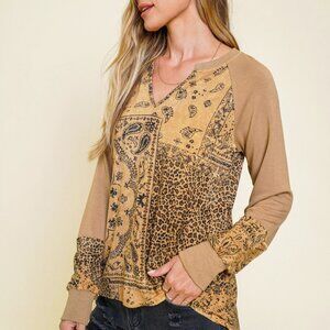 boho patchwork top, paisley leopard print shirt, camel brown v-neck blouse, long sleeve bohemian top, boutique mixed print shirt, boho chic casual top, lightweight boho sweater, trendy patchwork design, western boho blouse, festival outfit top