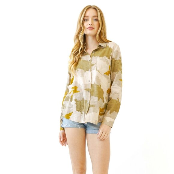 Neutral camo print button-down shirt in olive, beige, and muted yellow accents