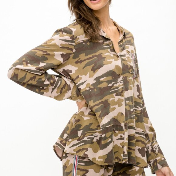 Camo Button Down Shirt, Oversized Utility Top, Green Brown Neutral Military Print