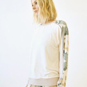 Cozy cream pullover top with soft camo print sleeves in muted green, beige, and tan tones