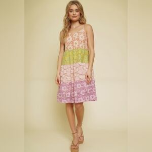 lace dress, colorblock dress, floral lace midi, tiered lace dress, boho summer dress, pastel lace dress, wedding guest dress, garden party outfit, feminine midi dress, colorful lace dress, spring occasion dress, festival style dress, sleeveless lace dress, vacation outfit, elegant lace sundress