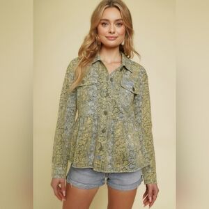 green jacket, animal print shacket, button down jacket, trendy spring jacket, lightweight layering piece, green utility shacket, casual streetwear, statement jacket, girly outerwear, animal print coat, festival jacket, stylish peplum jacket, patterned green top layer