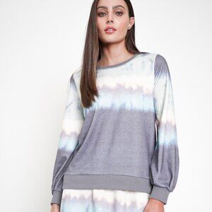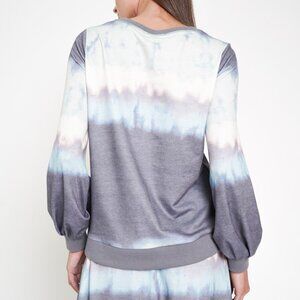 tie dye top, grey sweatshirt, lounge pullover, comfy chic sweater, balloon sleeve top, cozy loungewear, boho sweatshirt, pastel tie dye, soft knit pullover, boutique tie dye top, casual everyday top, neutral lounge outfit