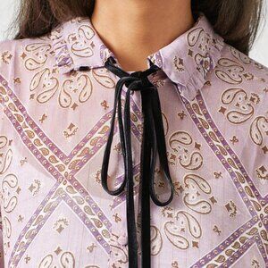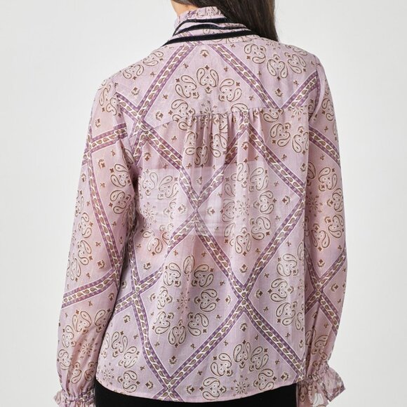 Lavender Paisley Print Blouse, Long Sleeve Tie Neck Top with Ruffle Cuffs