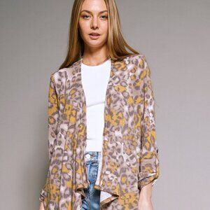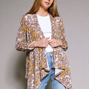 Leopard Print Waterfall Cardigan Brown Mustard Draped Open Front Layering Top