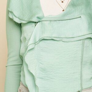 mint green blouse, ruffle front top, zip up top, draped cardigan, asymmetrical ruffle shirt, long sleeve blouse, lightweight spring top, satin look jacket, pastel green fashion top, boutique statement blouse, trendy soft green top