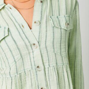 mint green blouse, striped button down, peplum shirt, gauze top, textured blouse, casual spring top, lightweight layering shirt, boho chic blouse, beachy button-up, everyday casual top, relaxed fit shirt, soft mint stripe top