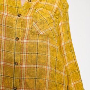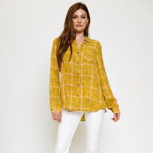 mustard plaid shirt, fall flannel blouse, casual plaid button-up, boutique plaid top, pumpkin patch outfit, autumn layering shirt, yellow check shirt, rustic fall style, cozy plaid top, plaid oversized shirt