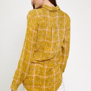Mustard yellow plaid button-up shirt with chest pocket detail