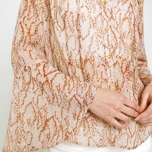 snake print blouse, neutral chiffon top, button down sheer blouse, animal print shirt, flowy long sleeve top, brown beige blouse, soft feminine blouse, lightweight airy top, trendy boutique top, classic printed shirt, chic neutral outfit, boho snake print