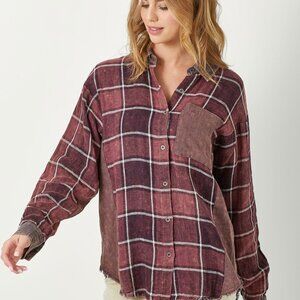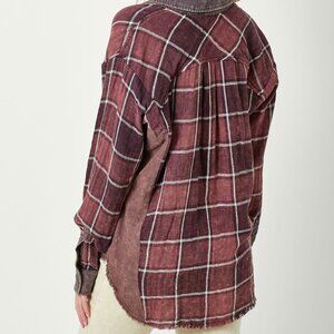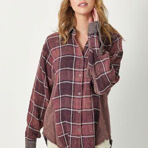 Burgundy and wine-toned plaid button-down shacket with vintage wash