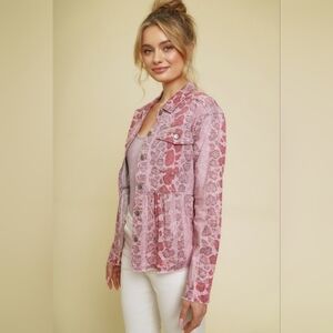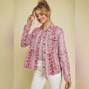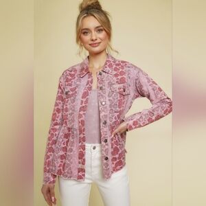pink jacket, animal print shacket, button down jacket, trendy spring jacket, lightweight layering piece, pink utility shacket, casual streetwear, statement jacket, girly outerwear, animal print coat, festival jacket, stylish peplum jacket, patterned pink top layer