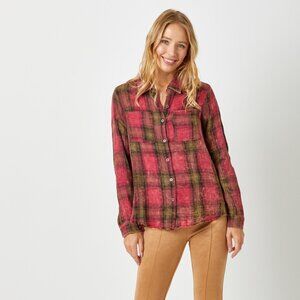 Soft plaid button-up shirt in rich red, olive, and black hues