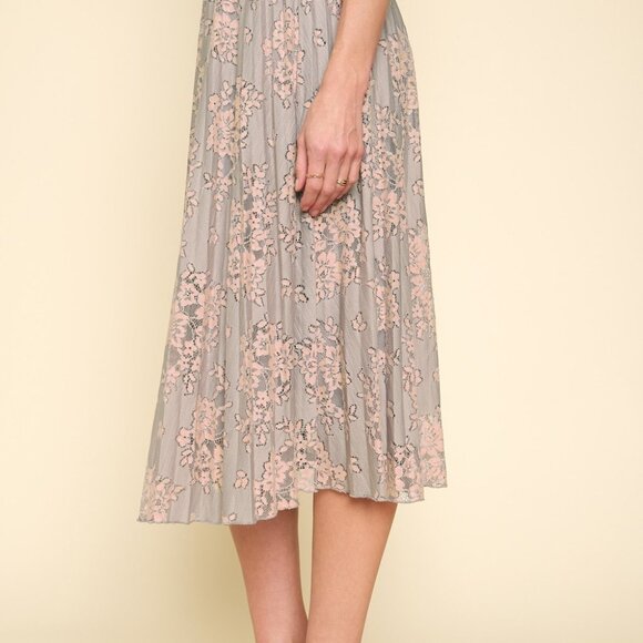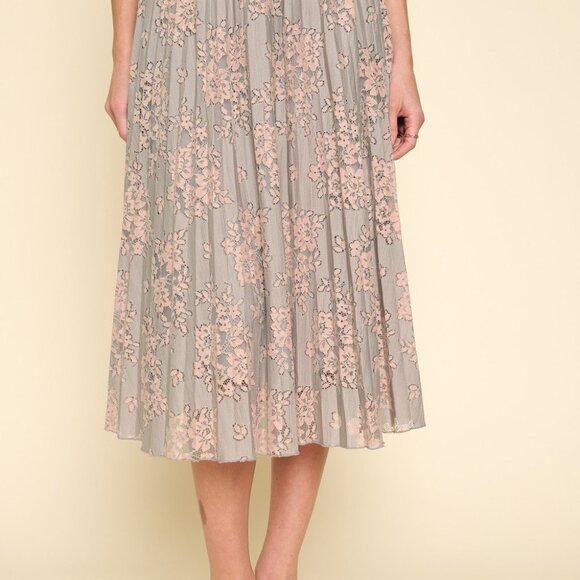 lace midi skirt, floral pleated skirt, romantic skirt outfit, gray pink skirt, wedding guest skirt, boho chic midi, boutique pleated skirt, spring outfit skirt, feminine lace fashion, dressy floral skirt