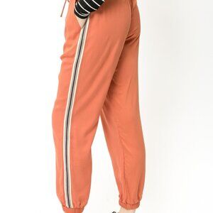 athleisure joggers, casual stripe jogger pants, sporty drawstring trousers, comfy lounge pants, rust jogger sweats, fall casual fashion, women’s elastic waist pants, side stripe joggers, trendy casual streetwear