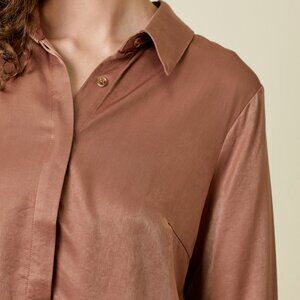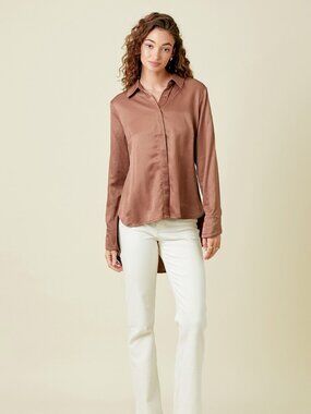 satin bronze blouse, mocha tunic top, pleated back shirt, high-low hem blouse, silky button-up, elegant satin top, fall neutral blouse, boutique workwear top, shiny bronze shirt, chic long sleeve blouse