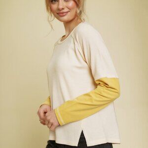 colorblock long sleeve top, waffle knit casual shirt, two-tone boutique top, cream yellow pullover, casual loungewear top, trendy long sleeve tee, lightweight transitional top, everyday chic top, boutique casual wear