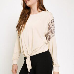 Neutral Beige Tie-Front Long Sleeve Top, Paisley Print Sleeve Detail