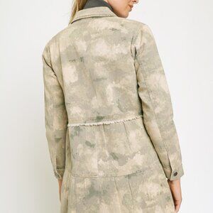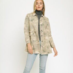 MYSTREE TIERED LONG TRUCKER JACKET Camo Utility Shacket, Beige Green Distressed