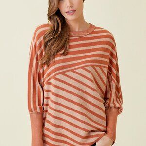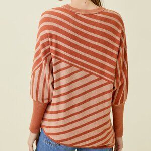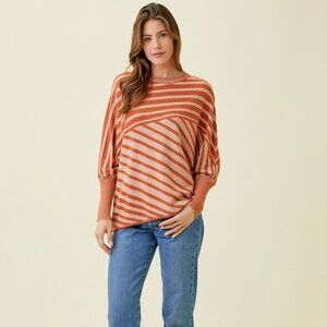 MYSTREE Taupe & Cream Diagonal Stripe Dolman Sleeve Sweater Asymmetrical Hem