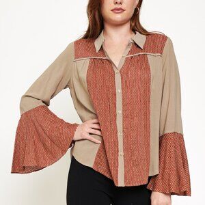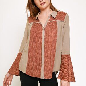 boho blouse, taupe rust button down, chic work blouse, fall casual top, flared sleeve blouse, boutique button down shirt, textured panel blouse, earthy tone blouse, trendy statement top, casual chic fashion blouse