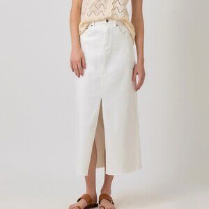 MYSTREE White Denim Maxi Skirt, Front Slit, Raw Hem