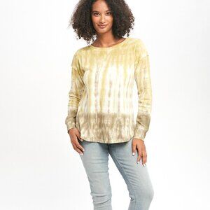 tie dye long sleeve, waffle knit top, boho casual shirt, cozy loungewear, yellow tie dye pullover, beige tie dye sweater, casual crewneck, trendy tie dye fashion, comfy everyday top, boutique style shirt, poshmark trending top, fall layering piece, boho chic style, lightweight pullover