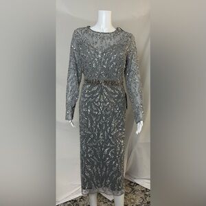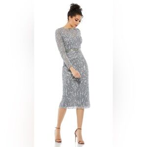 Mac Duggal 5521 Platinum Sequin Cocktail Dress. Fully covered in shimmering sequins, this long-sleeve midi dress features a flattering fitted silhouette, crew neckline, and sheer sleeves for a timeless and sophisticated look.