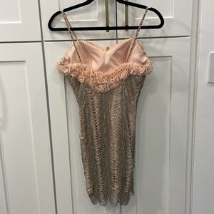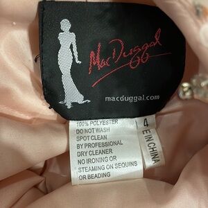 Max Duggal short dress in blush coloured satin like material with draping silver coloured bead detail, floral trim, sweetheart neckline, beaded/jewelled spaghetti straps, side zipper and clasp closure. Size 4. Good used condition but needs to be spot/dry cleaned as it was worn once and has marks on the interior lining and throughout the floral trim. Interior hanger straps were cut out. This dress is very heavy due to the beading but is definitely a showstopper! Could use a visit to the dry cleaner. Please see photos, measurements are for reference only. Reasonable offers welcome!