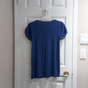 Stylish blue top with puffy polka dotted short sleeves. Features a front pocket. Perfect for casual special outings or office wear!