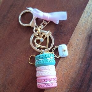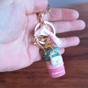 Charming macaron keychain with pink bow and gold accents hearts and bag. Features pink, blue, and white macarons.