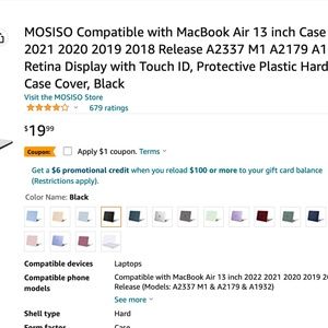 Plastic Hard Shell (Black). There is one cm crack because I put it the wrong way but other than that it is all good. Price is negotiable. MOSISO Compatible with MacBook Air 13 inch Case 2022 2021 2020 2019 2018