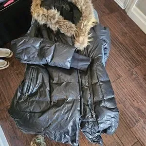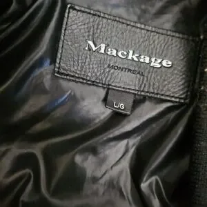 Elegant black puffer jacket by Mackage montreal Features a stylish faux fur trim on the hood. Ideal for cold weather.
