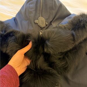 Elegant black puffer jacket by Mackage. Features luxurious fur trim. Perfect for warmth and style.