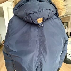 WINTER DOWN BOMBER WITH FUR HOOD. Size 38 in Navy Blue. It’s in good condition and the fur hood is removable. Perfect for Montreal winter weather.