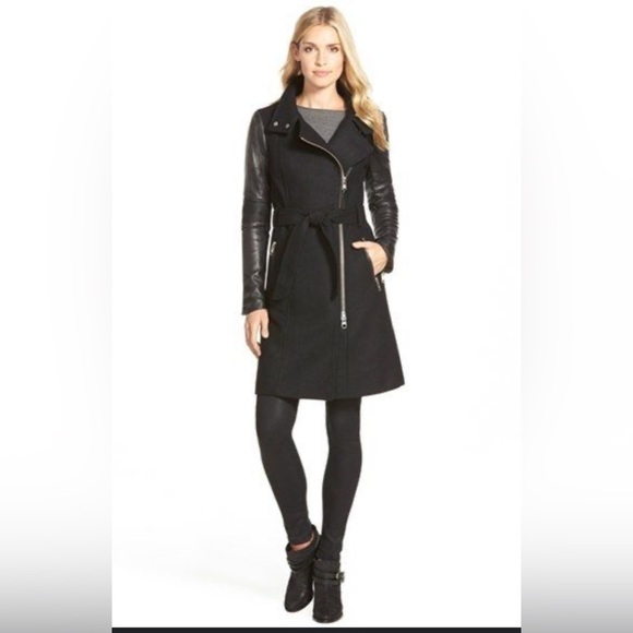 Elegant black trench coat with leather sleeves. Features a belted waist and zip details. Ideal for chic style.