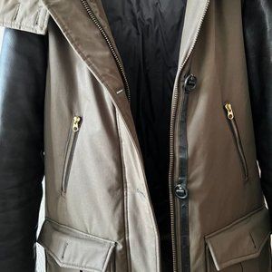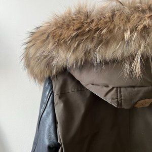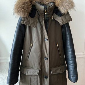 Cynthia-F5 Mackage down coat with shearling and fur removable hood and leather sleeves.