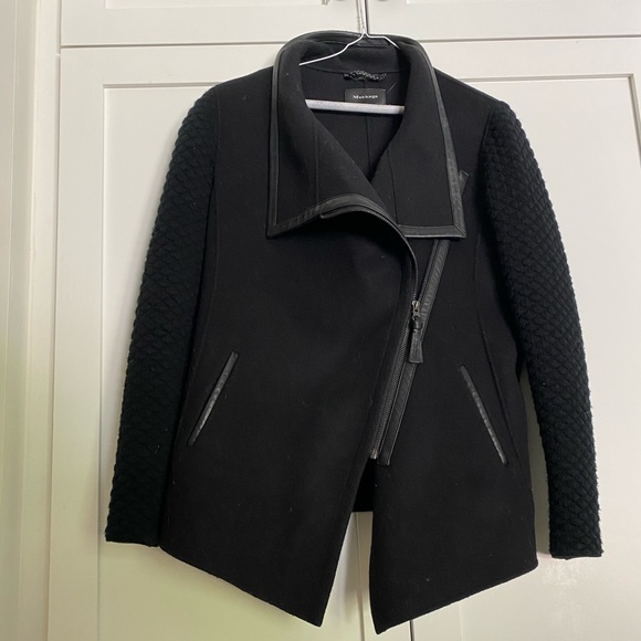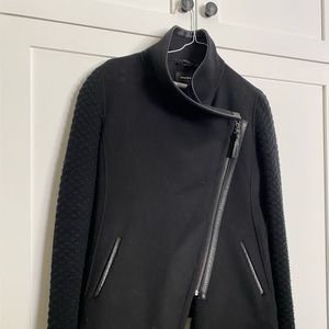Black Mackage jacket with quilted arm detail and cross body leather zipper.